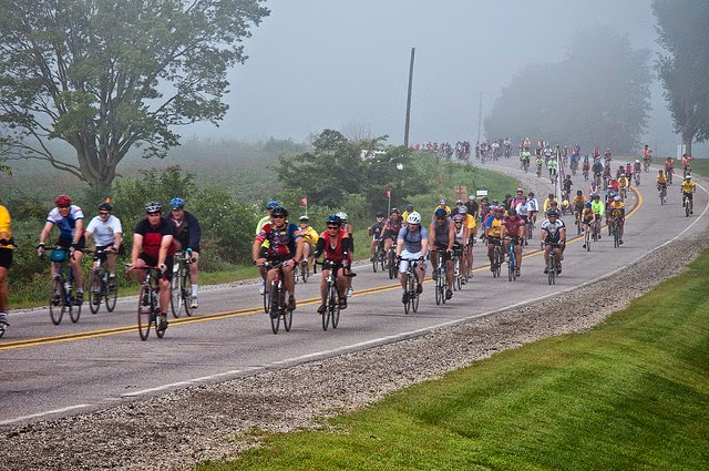 RAGRAI stands for Register’s (as in the Des Moines Register newspaper) Annual Great Bicycle Ride Across Iowa. Yes, that is the vacation he has chosen. He and three of his buddies are riding 481 miles across the state of Iowa. In one week. With 10,000-plus other lunatics. They have employed the services of Pork Belly Ventures to carry their gear and deliver it from campsite to campsite. Where they will sleep. In tents. Without fans to drown out the sounds of nature. They will make use of mobile shower trailers. And Port-a-Potties. It will be 90 degrees, hot and humid. They will ride, rain or shine. They will be given instructions on what to do in case of a tornado.